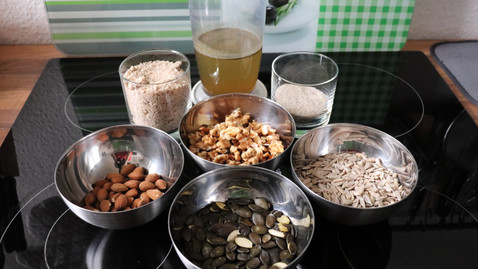 Für das Brot müsst ihr lediglich alle trockenen Zutaten vermischen und das Wasser unterrühren. Die Masse in eine Kastenform geben und alles 20 Min quellen lassen. Anschließend 45 Min. bei 180 °C im vorgeheißten Backofen backen, abkühlen lassen und fertig!